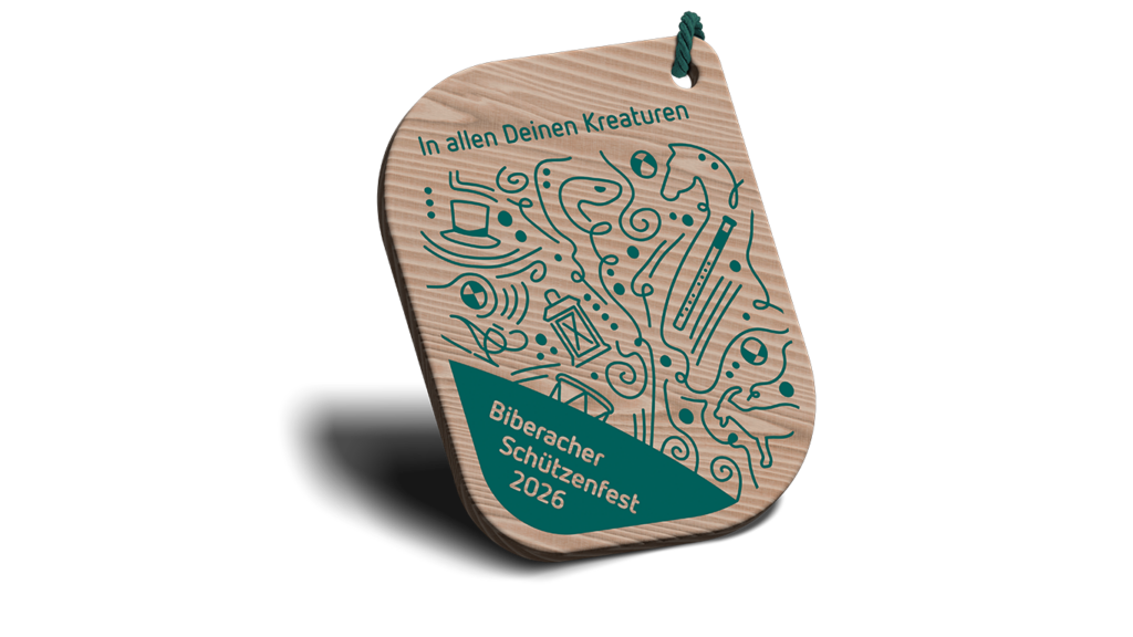 Das Festabzeichen für das Biberacher Schützenfest 2026 hat die Liedzeile „In allen Deinen Kreaturen“ aus dem Schützenfestlied als Leitmotiv. Mit seiner kreativen Gestaltung, der einzigartigen Form und vielen Details spiegelt das Abzeichen aus Holz die Vielseitigkeit und Einzigartigkeit aller Schützenfest-Teilnehmenden wider. Holger Diehl hat das Festabzeichen wie in den Vorjahren gestaltet.